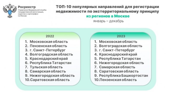 Из других регионов на оформление недвижимости в Москве Управлением принято 66 098 заявлений по экстерриториальному принципу, что на 72,7% выше аналогичных показателей 2022 года (38 264).