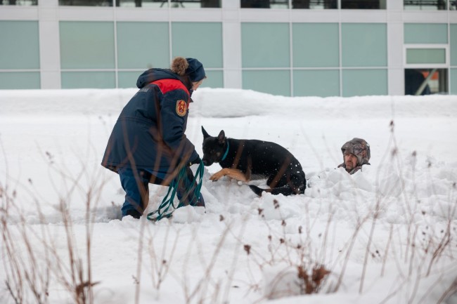 Основная задача зимой – отработка навыков поиска людей при отрицательных температурах в снегу. Роль условных пострадавших выполняют статисты из числа кинологов-волонтеров. Эти люди умеют разбираться в поведении собак, чтобы не навредить системе подготовки и помочь животному в поддержании интереса к тренировкам. Собаки, используя нюх, учатся не только находить человека, но и правильно передвигаться по глубокому снегу, удерживать частоту дыхания для сохранения возможности облаивать статиста до подхода своего хозяина, экономя физические силы.