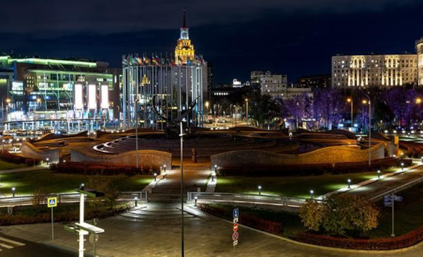 На площади Евразии, которая находится возле Киевского вокзала в Дорогомилове, сотрудники комплекса городского хозяйства сделали ландшафтное освещение.